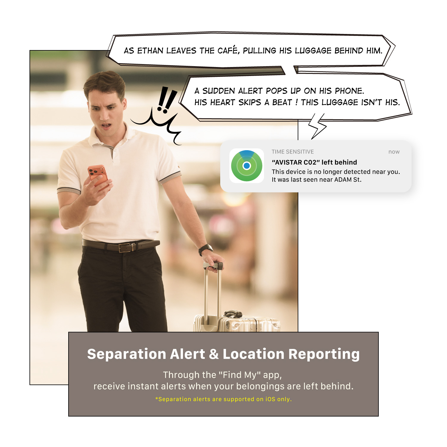 • Supports separation alerts and location history. Get instant notifications when your item is left behind
