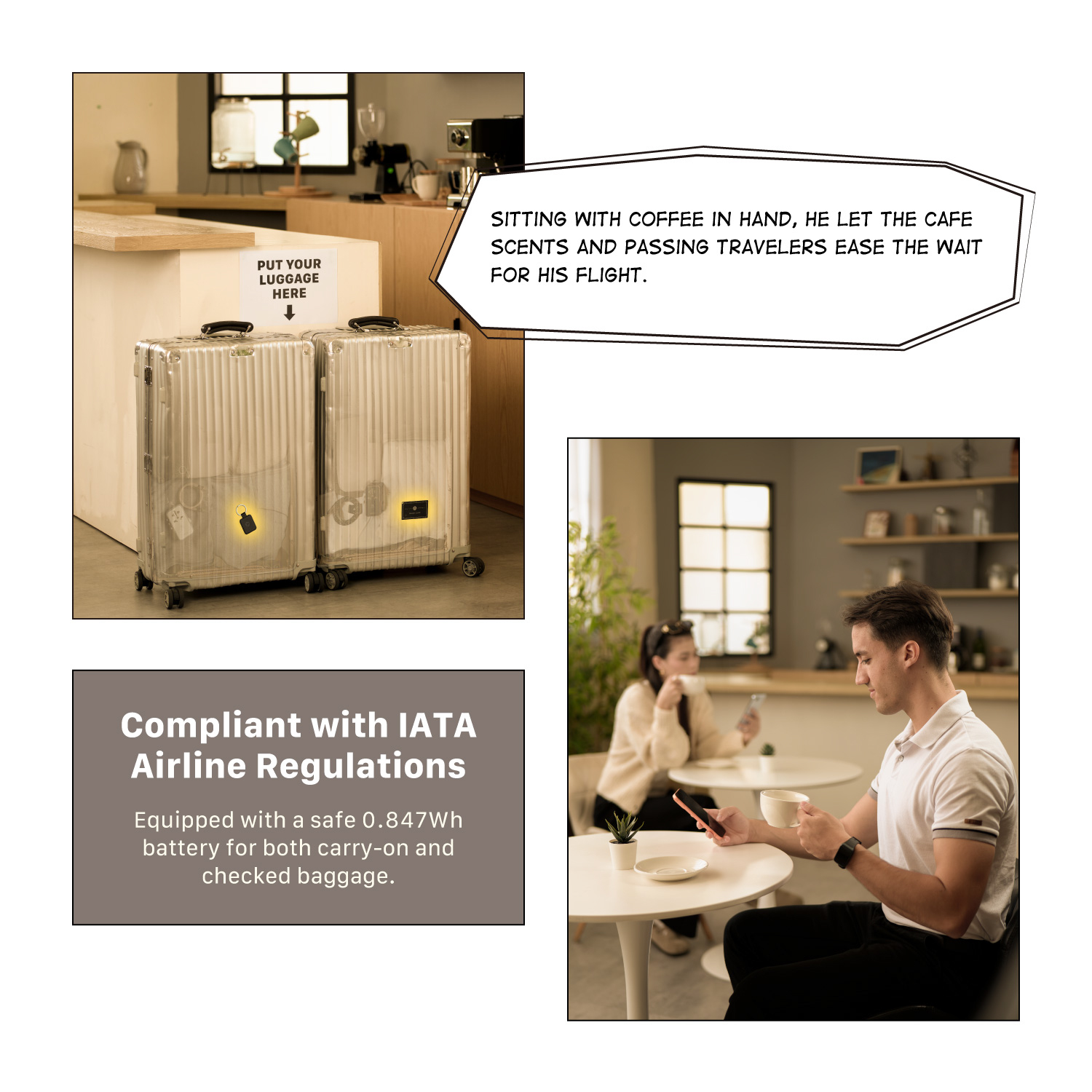 • Built-in 0.847Wh lithium battery, compliant with IATA air travel standards. Safe for carry-on or checked luggage