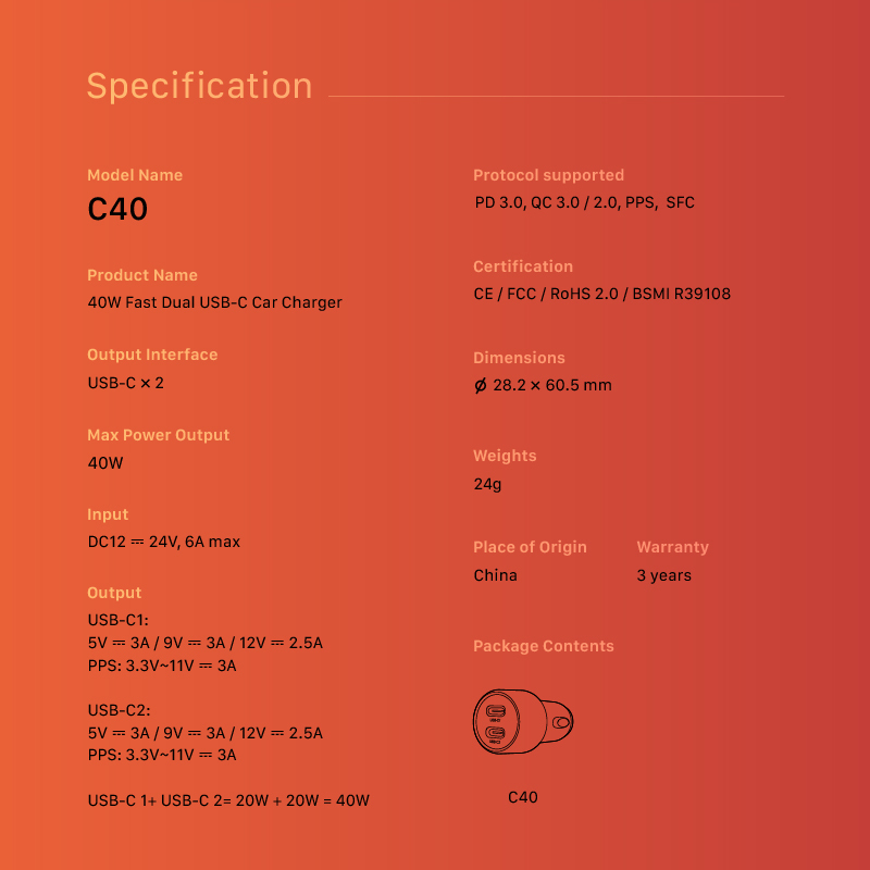 · Total power output up to 40W, with a Power Delivery (PD 3.0).