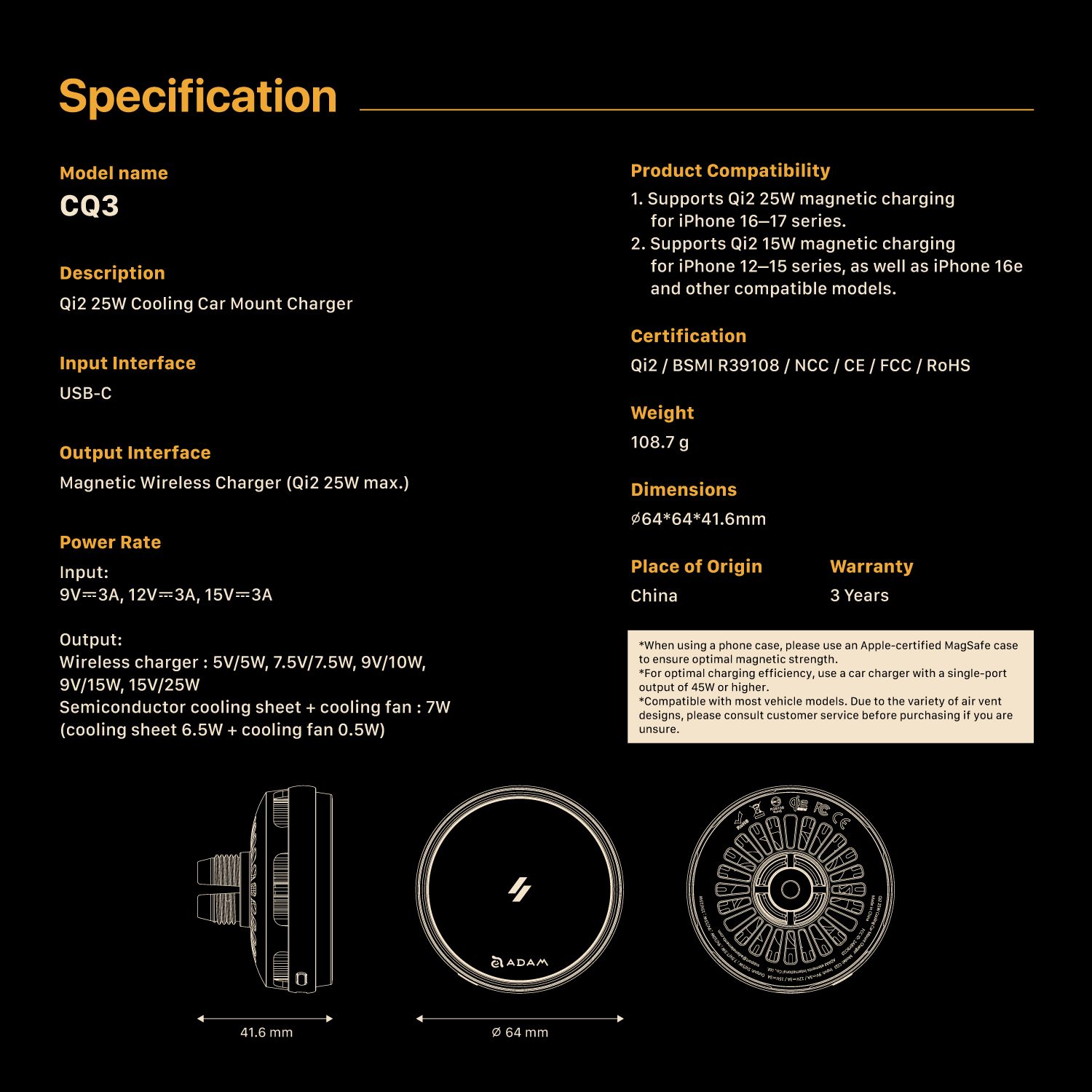 • CQ3 Compatibility: Compatible with iPhone 12+ (MagSafe). Android requires a magnetic case (MFM certified recommended).