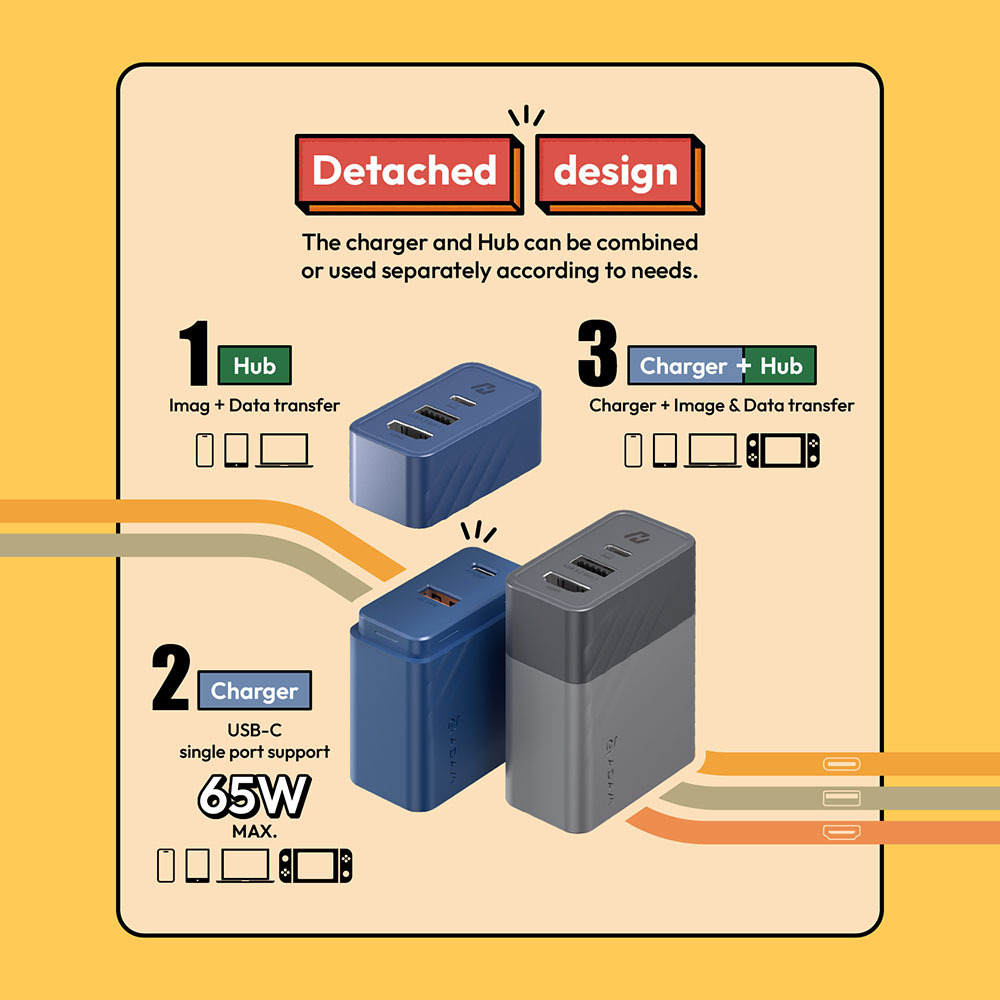 • The charger and hub feature a detachable design, allowing simultaneous charging, video output, and data transfer when used together.