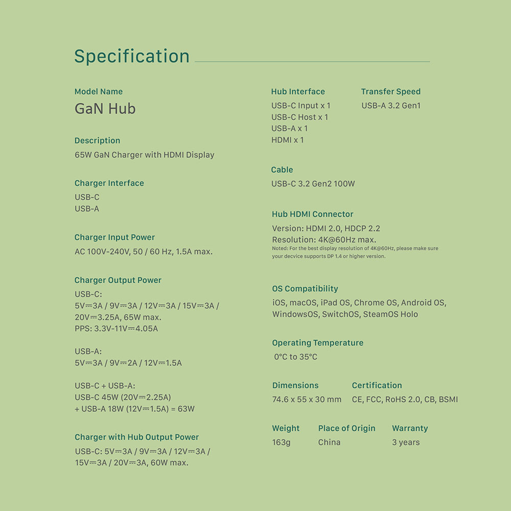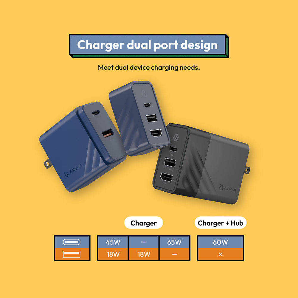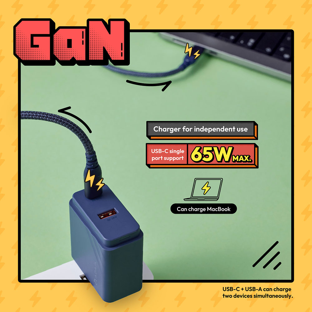 • Integrated with Gallium Nitride (GaN) technology, supporting PD3.0 65W charging. The USB-C port delivers a maximum of 65W, including PPS technology. The USB-A port provides a maximum of 18W. When both ports are connected at the same time, the USB-C port supports up to 45W and the USB-A port supports up to 18W.