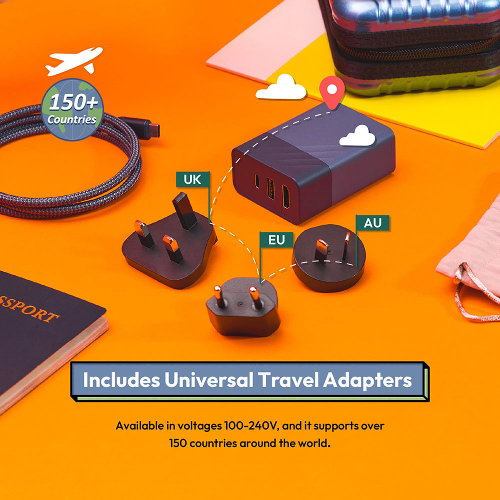 • Included US, UK, EU, and AU plugs 100-240V travel plugs for use in 150 countries.
