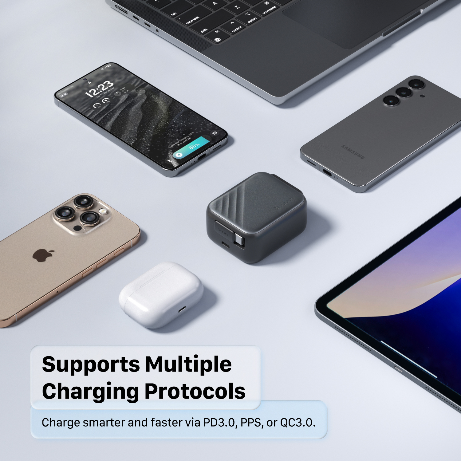 • Supports PD3.0 / PPS / QC3.0 fast charging protocols to quickly power up iPhone, iPad, MacBook Air, and more
