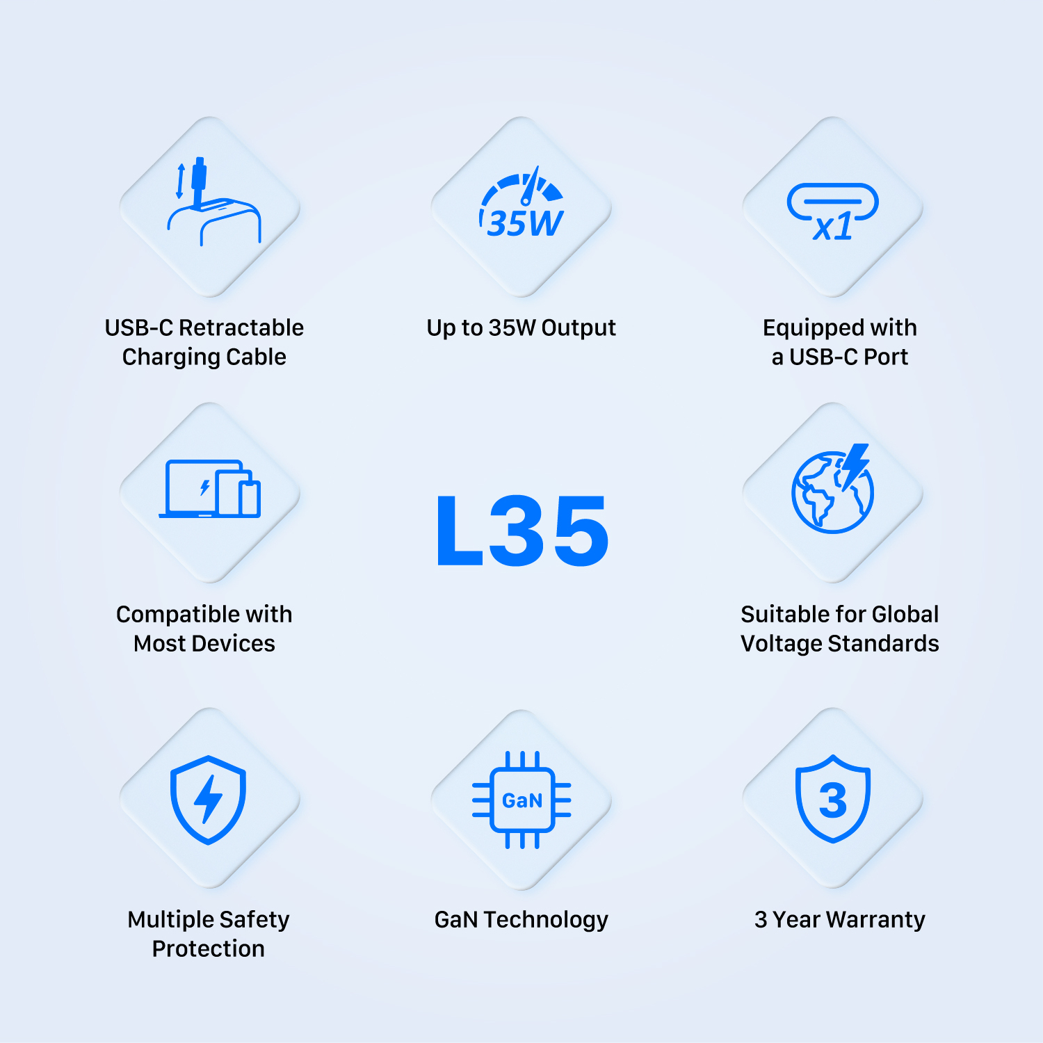L35 UK GaN 35W Wall Charger with Built-In USB-C Cable (2 Sets)