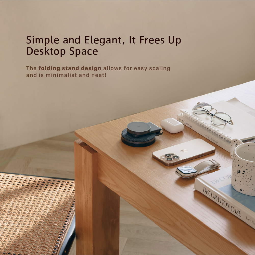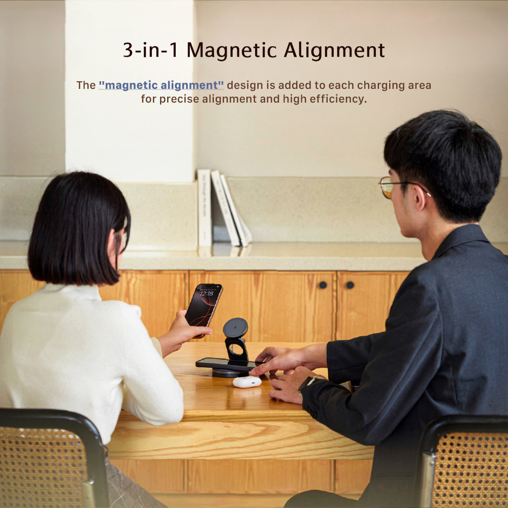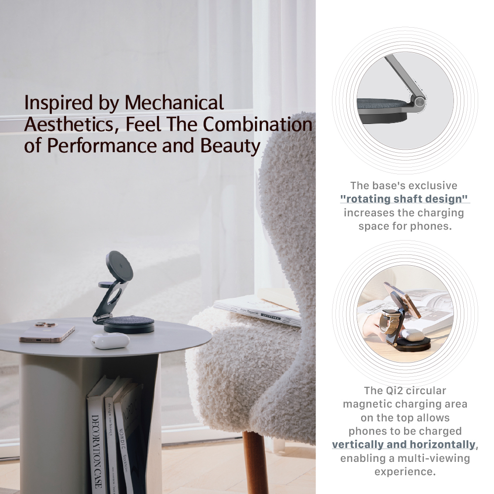 • 3-in-1 Foldable Magnetic Charging Stand, simultaneously supports iPhone, Apple Watch, AirPods, and also supports AirPods with MagSafe magnetic charging case. It offers three charging modes, allowing for unrestricted collocation.