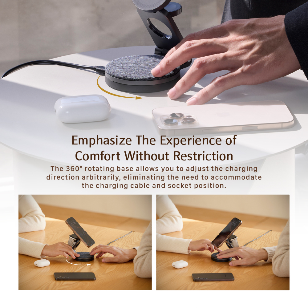 • The charging dock features a 360-degree rotating design, ensuring stability and preventing it from tipping over.