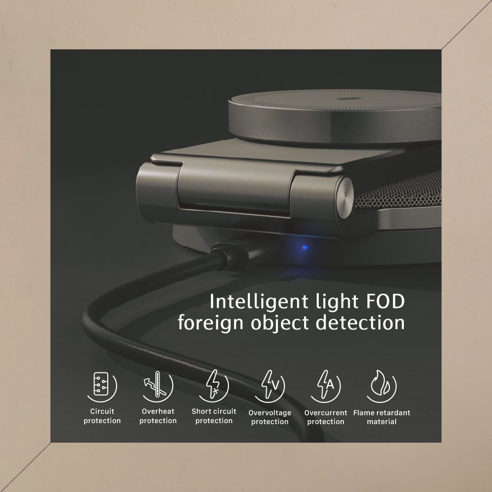• Built-in foreign object detection mode protects your phone and metal objects from electromagnetic damage and offers overcharge, overheat, and short-circuit protection.