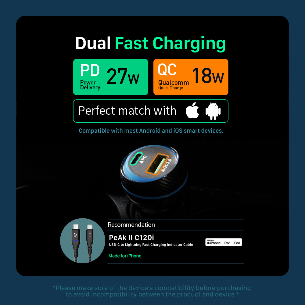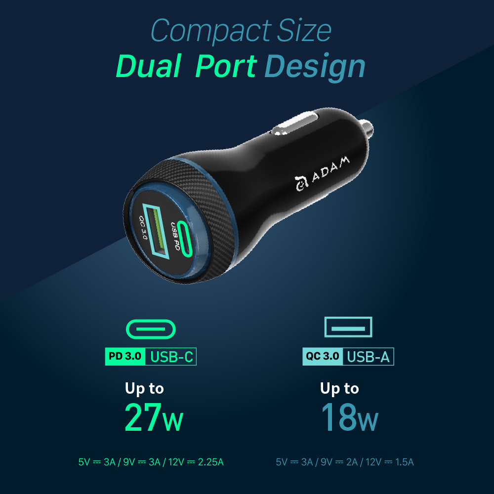 .Single port fast charge up to 27W / dual port up to 27W+18W.