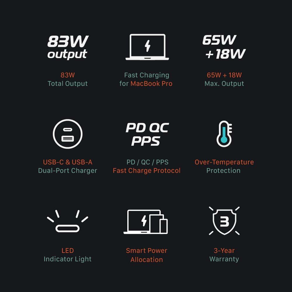.Dual port up to 65W+18W, with a PD/QC/PPS support.