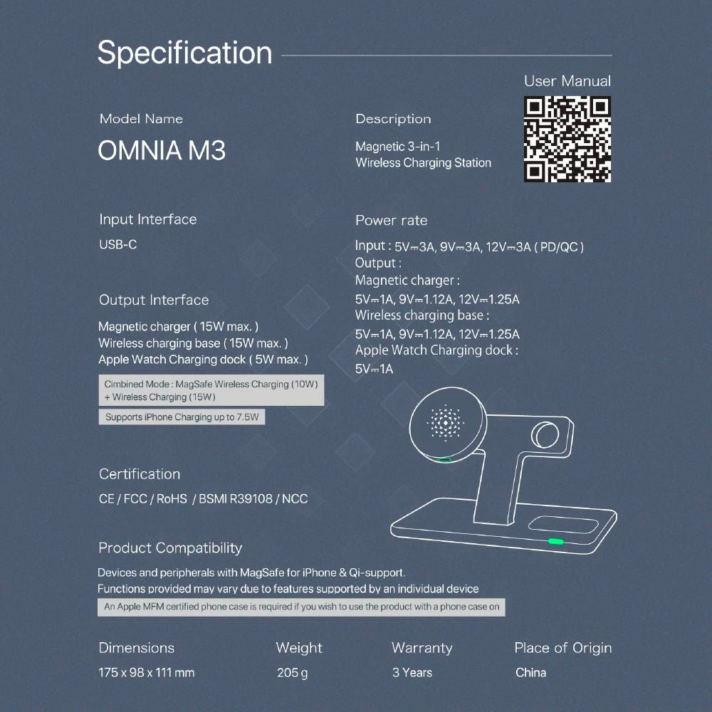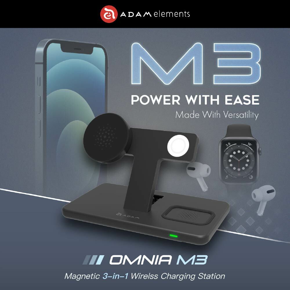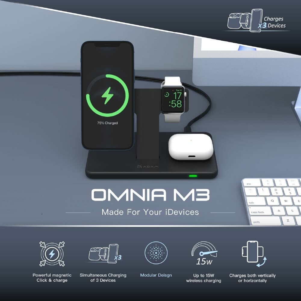 ・The OMNIA M3 charger with MagSafe technology connects right to the back of your iPhone 12 / 13 and keeps it secure in place while charging.