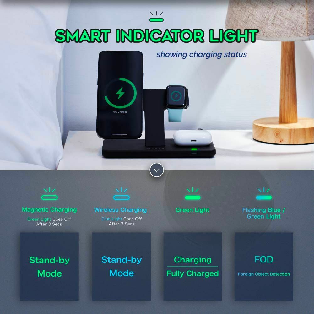 .With stylish and functional 3-in-1 design, charge your latest iPhone 12 / 13 series along with your AirPods and Apple Watch at the same time.