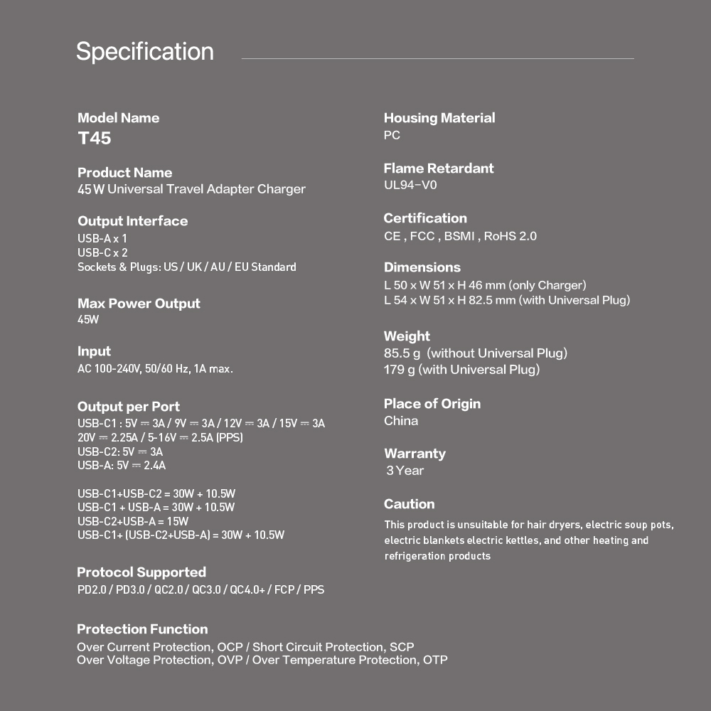 • USB-C1 (PD 3.0) supports fast charging up to 45W; even when all three ports are used  simultaneously, USB-C1 can still support 30W.