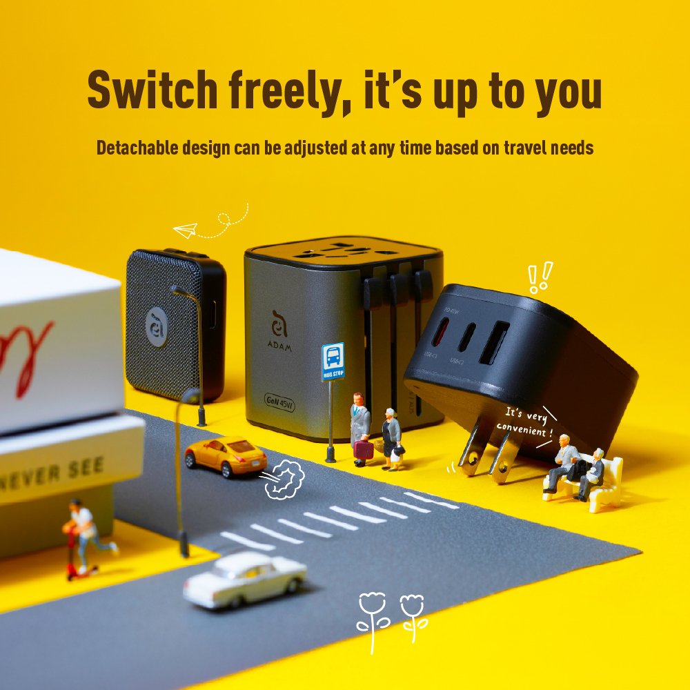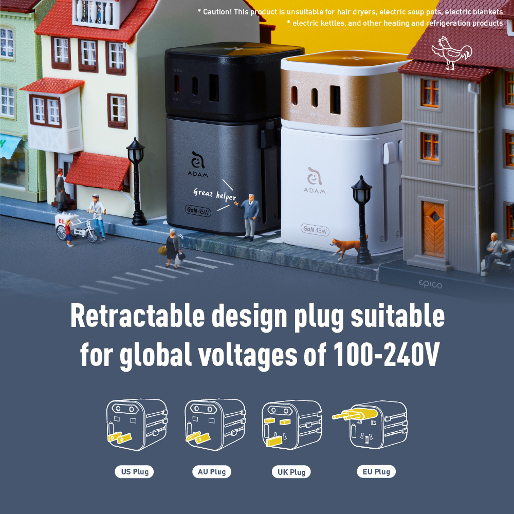 • Retractable multi-country plug with safety lock design to secure the plug and prevent it from retracting.