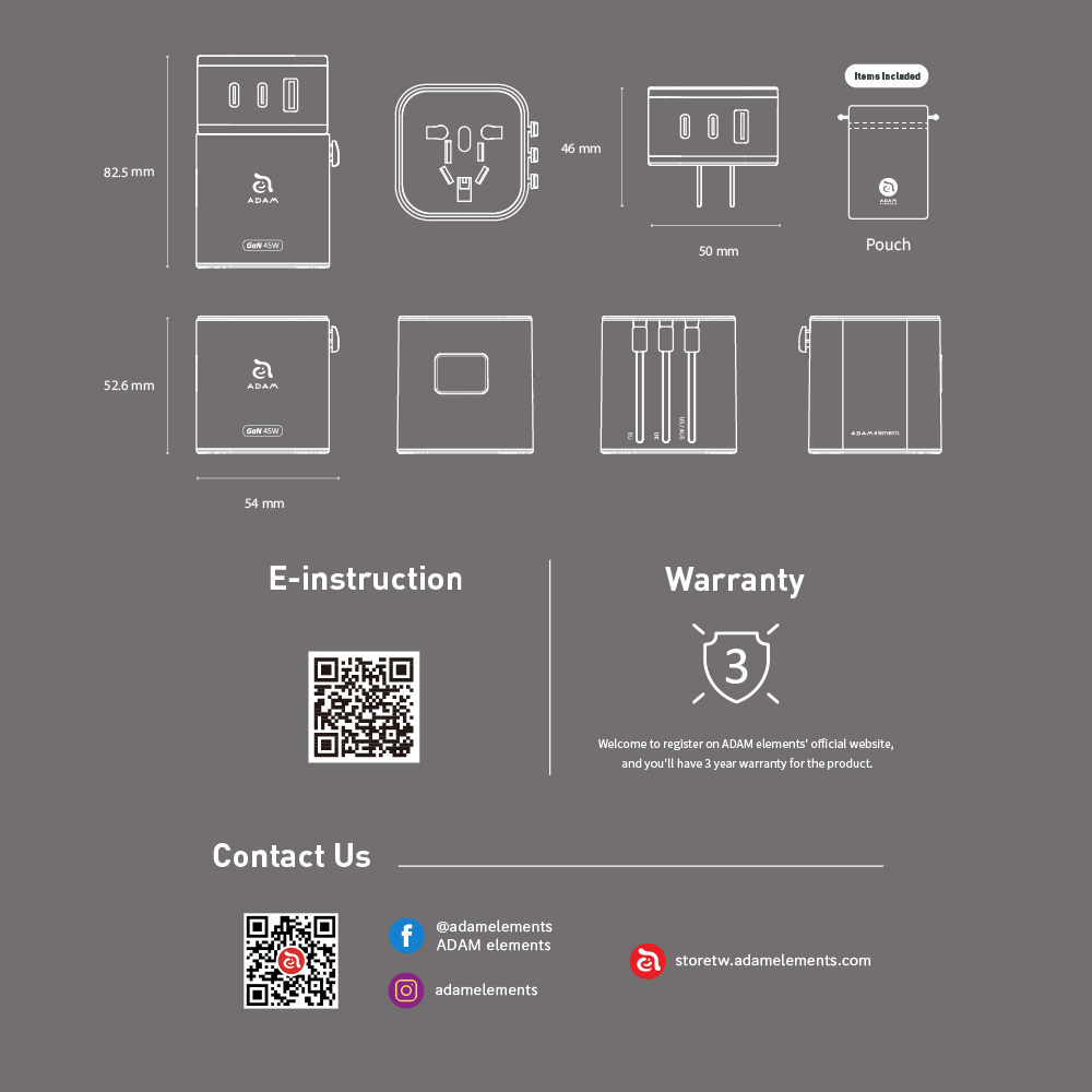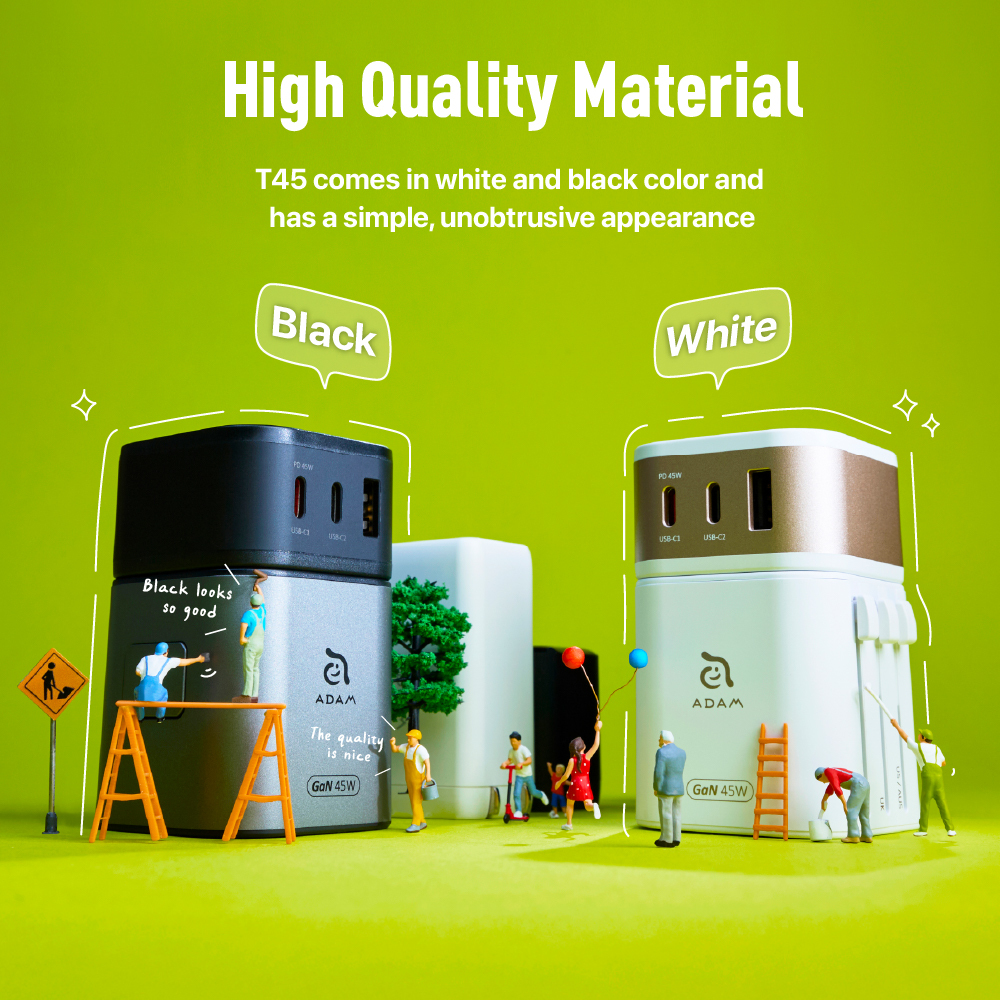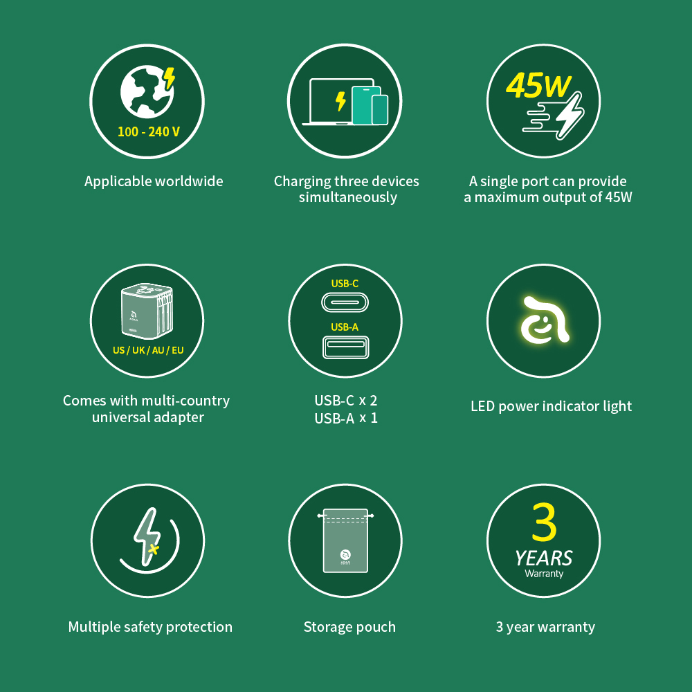 • Retractable multi-country plug with safety lock design to secure the plug and prevent it from retracting.