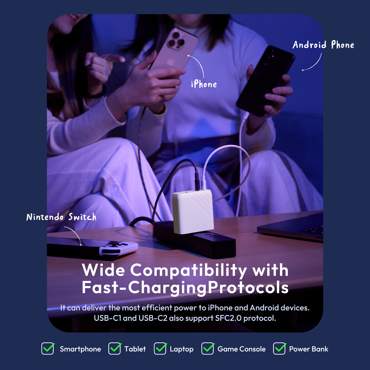 • Compatible with iPhone 15 or later, Android devices, iPad Pro 11"/12.9" (2018 or later), iPad Air 4 (2020 or later), iPad 10, iPad mini 6, MacBook Air, MacBook Pro 13", and laptops supporting up to 100W USB-C charging