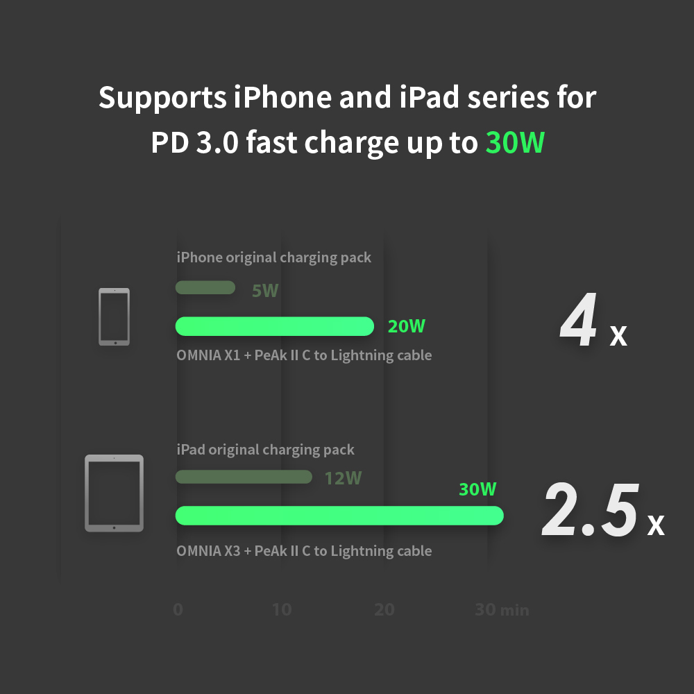 ・ Supports iPhone and iPad series for Power Delivery (PD 3.0) fast charge up to 30W.