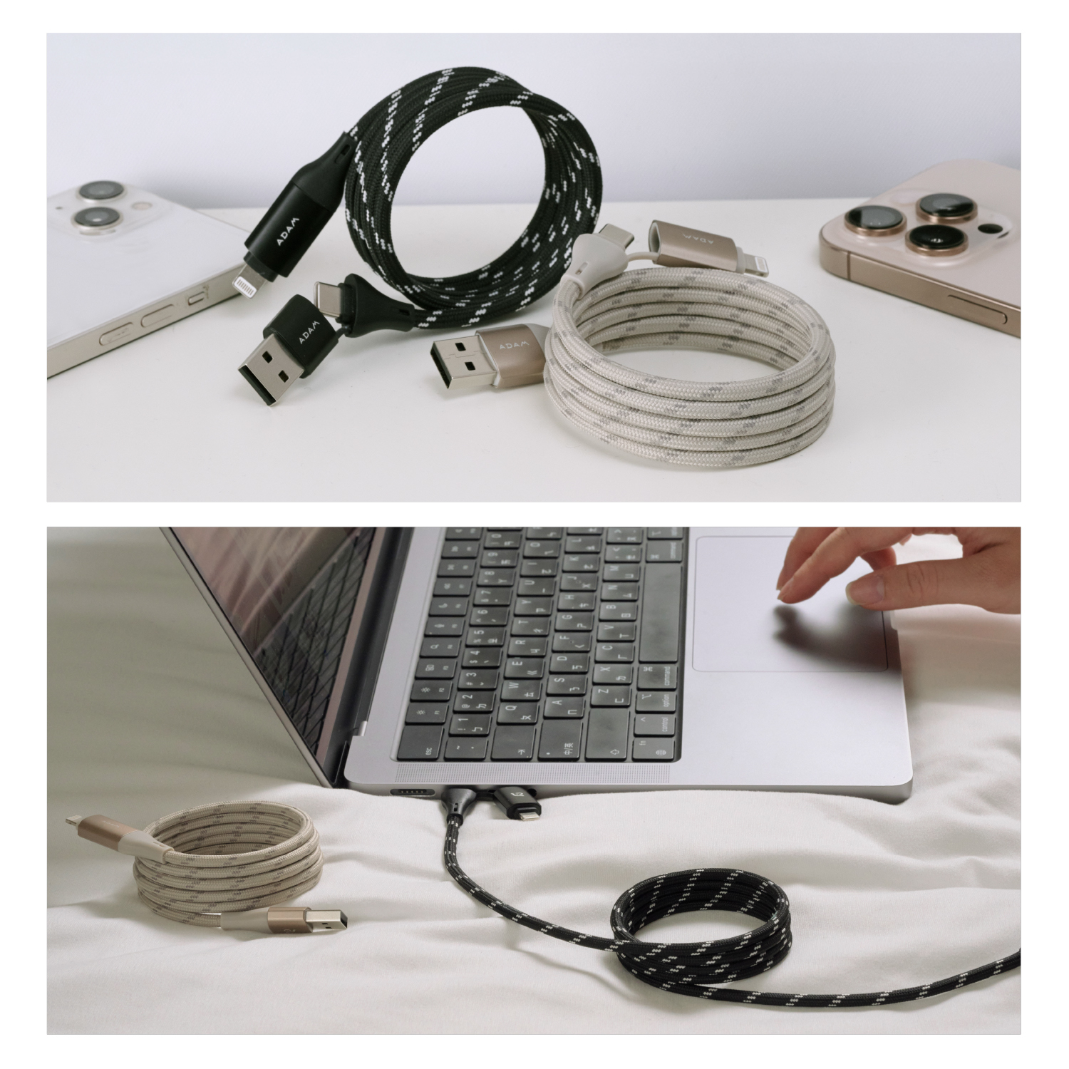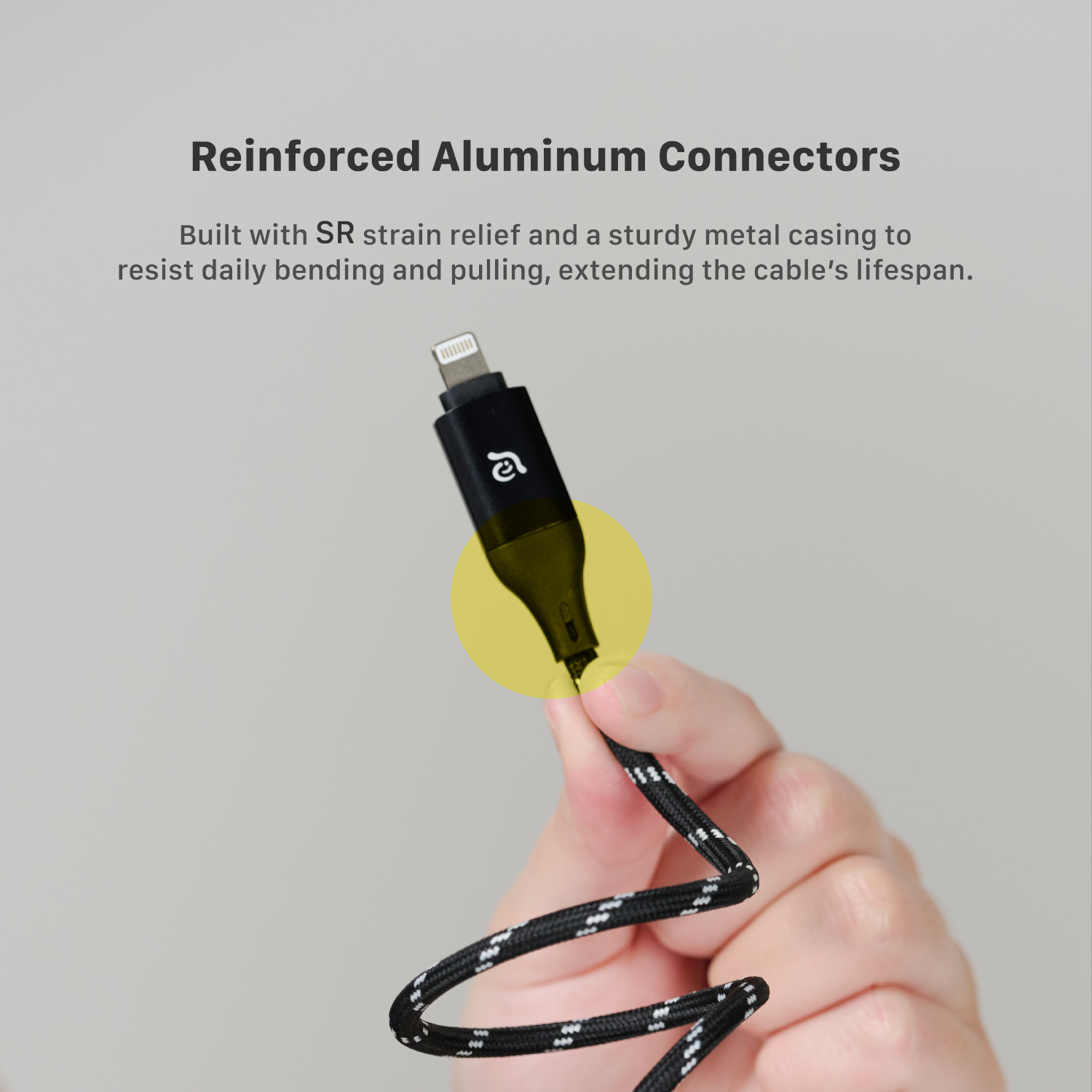 • Unique, flexible nylon braided cable that resists tangling and is highly durable.