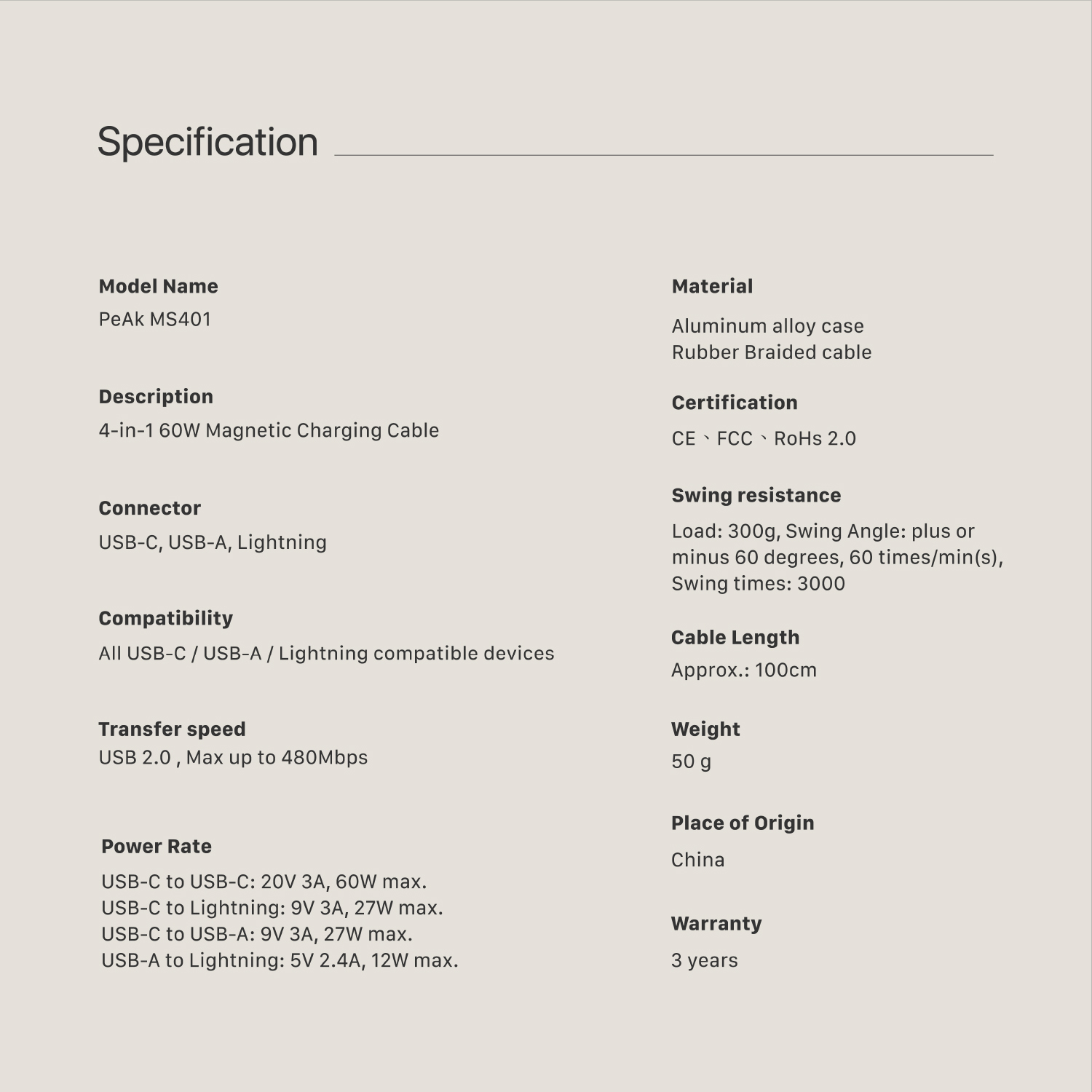 PeAk MS401 4-in-1 60W Magnetic Charging Cable