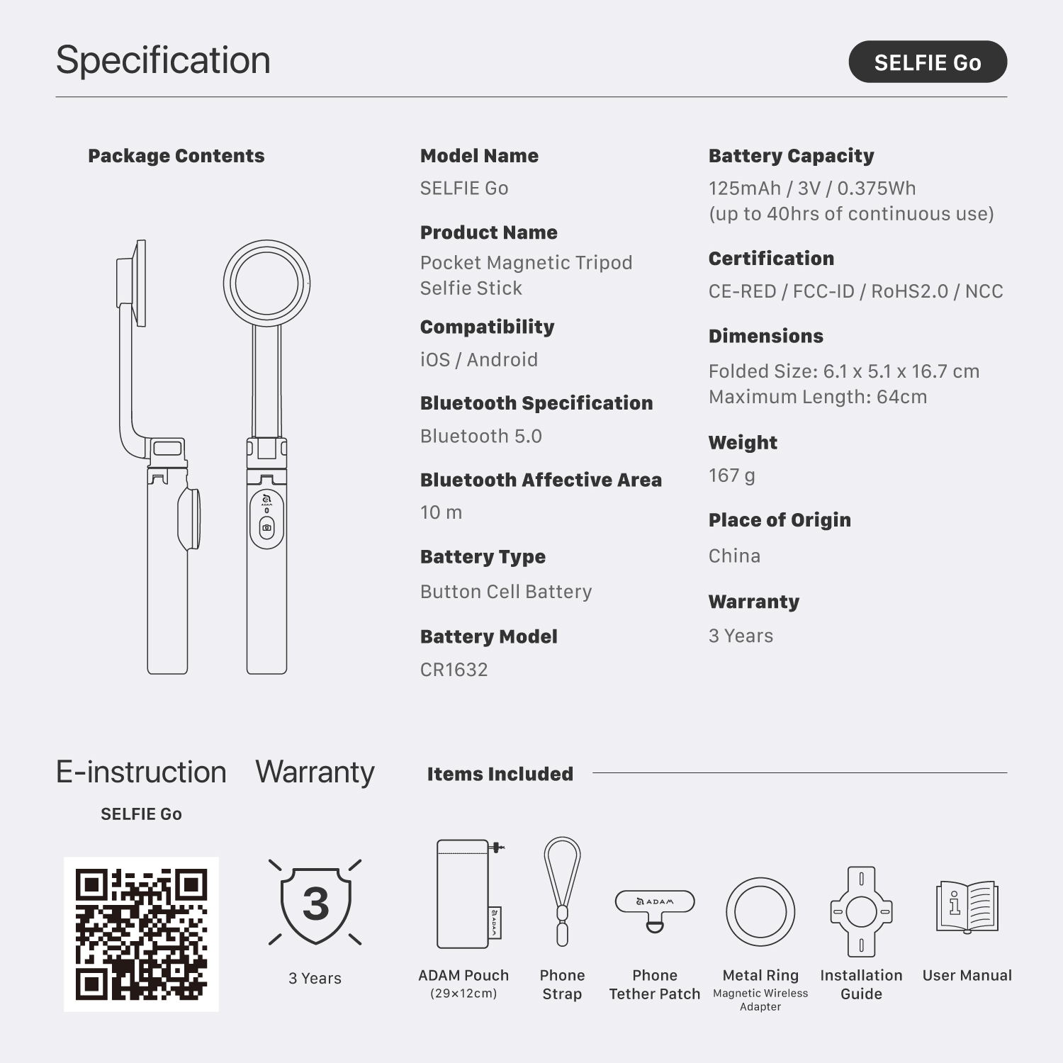 • Selfie stick seamlessly transforms into a tripod, offering flexibility for various shooting needs