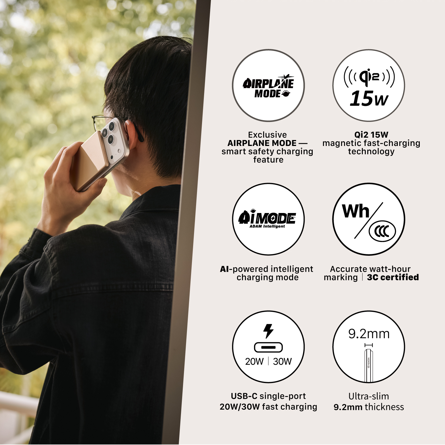 • 5000mAh capacity, ultra-slim 9.2mm design and just 117g lightweight, certified with the latest Qi2 15W magnetic charging standard