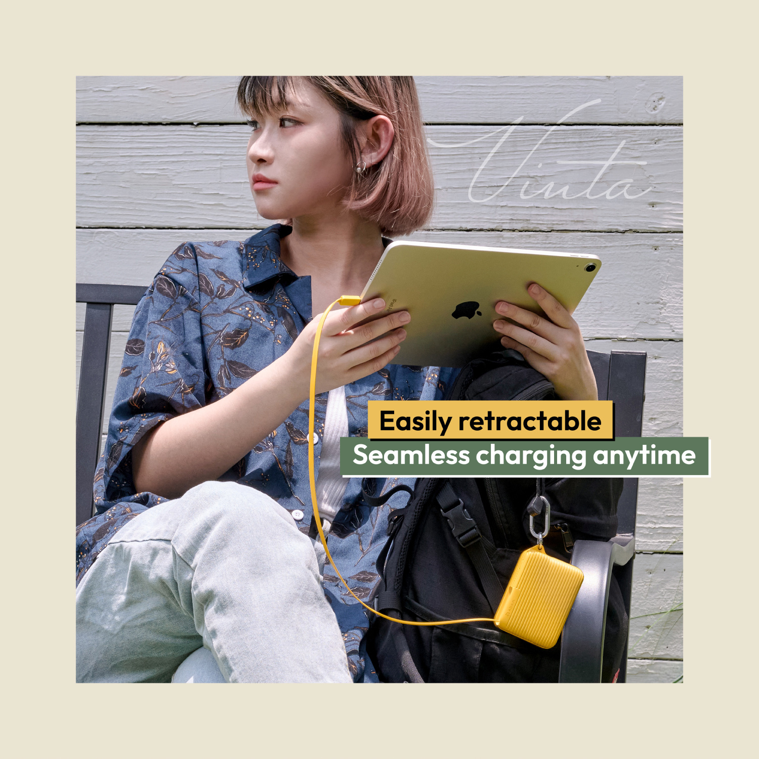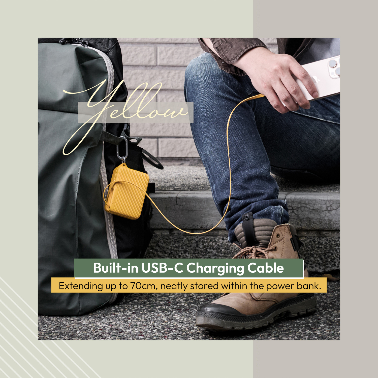 • Hidden retractable USB-C cable, extending up to 70cm, neatly stored within the power bank