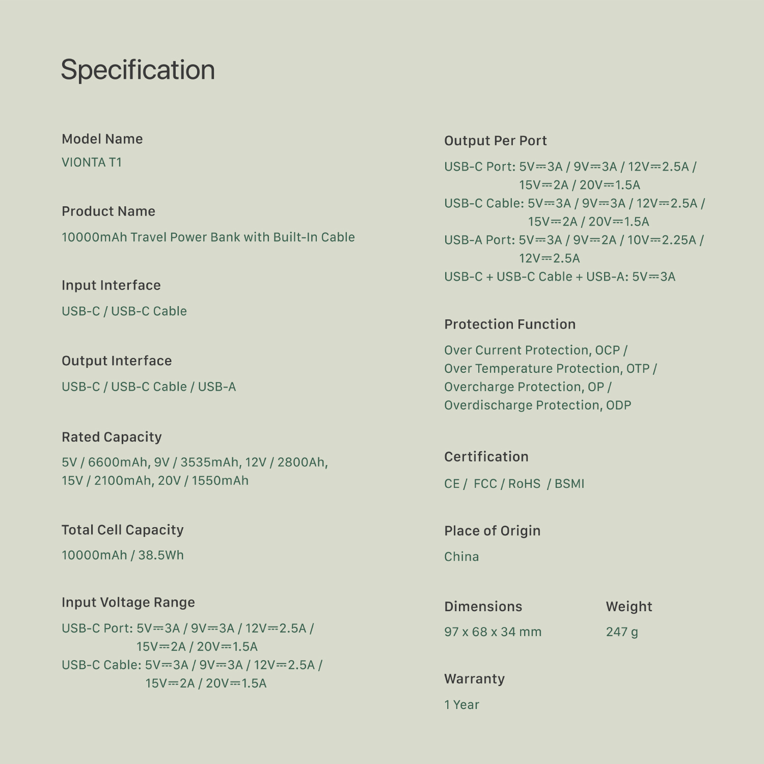 VIONTA T1 10,000mAh Travel Power Bank with Built-In Cable
