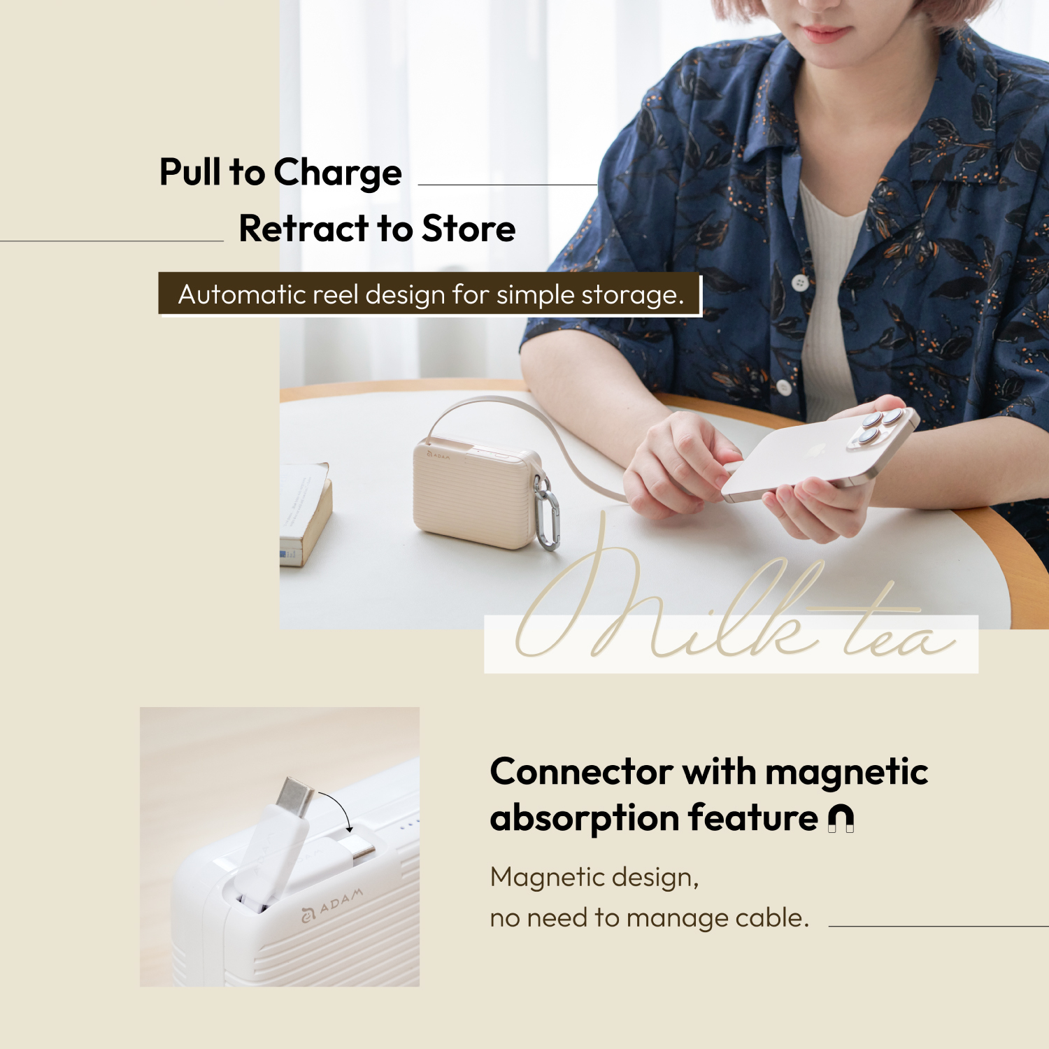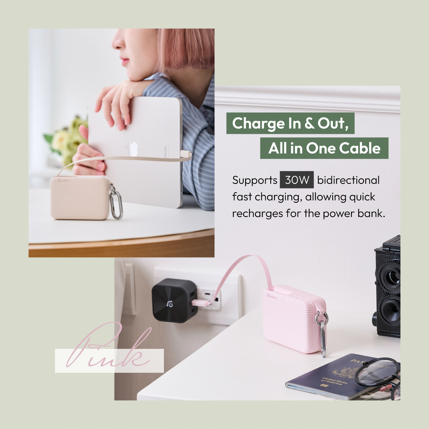 • Built-in 10000mAh power bank with a suitcase-inspired design, compact yet powerful