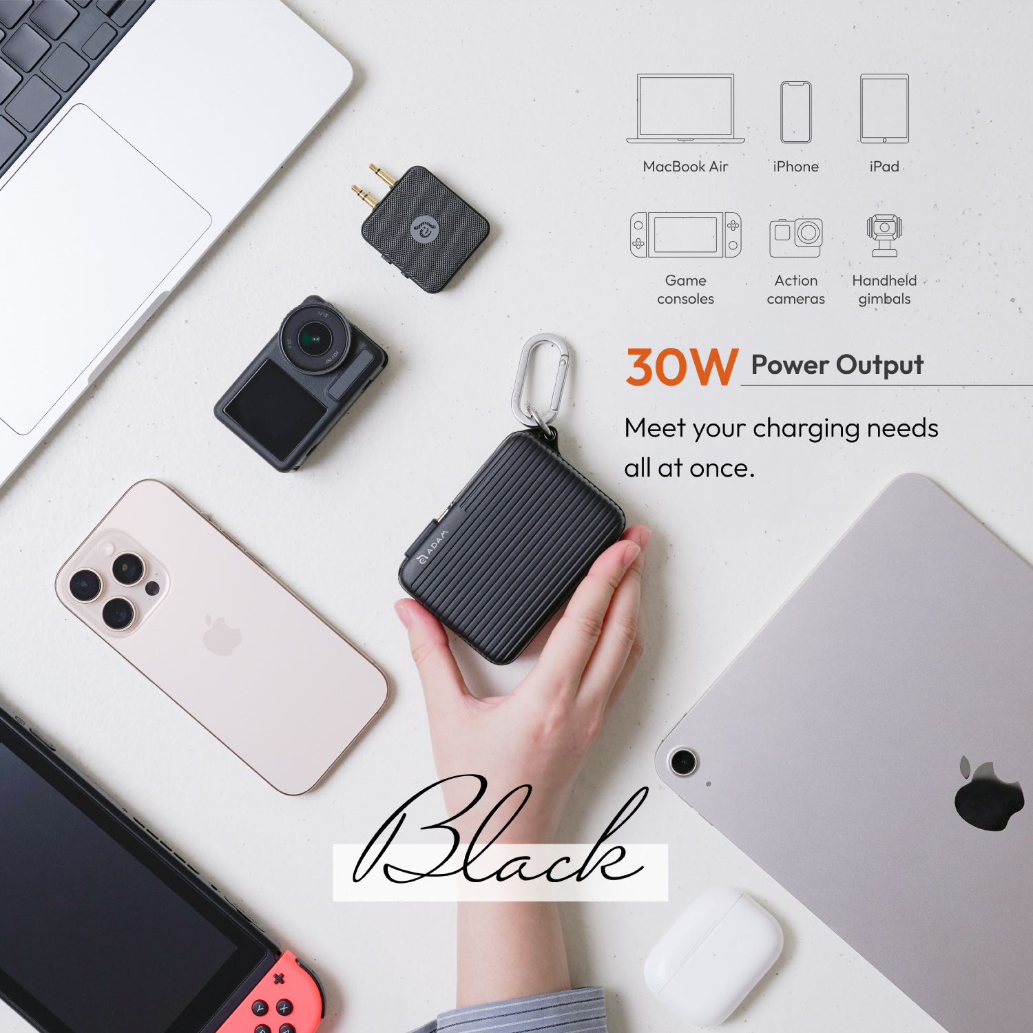 • Includes a universal hook for easy attachment anywhere, enabling quick and convenient charging