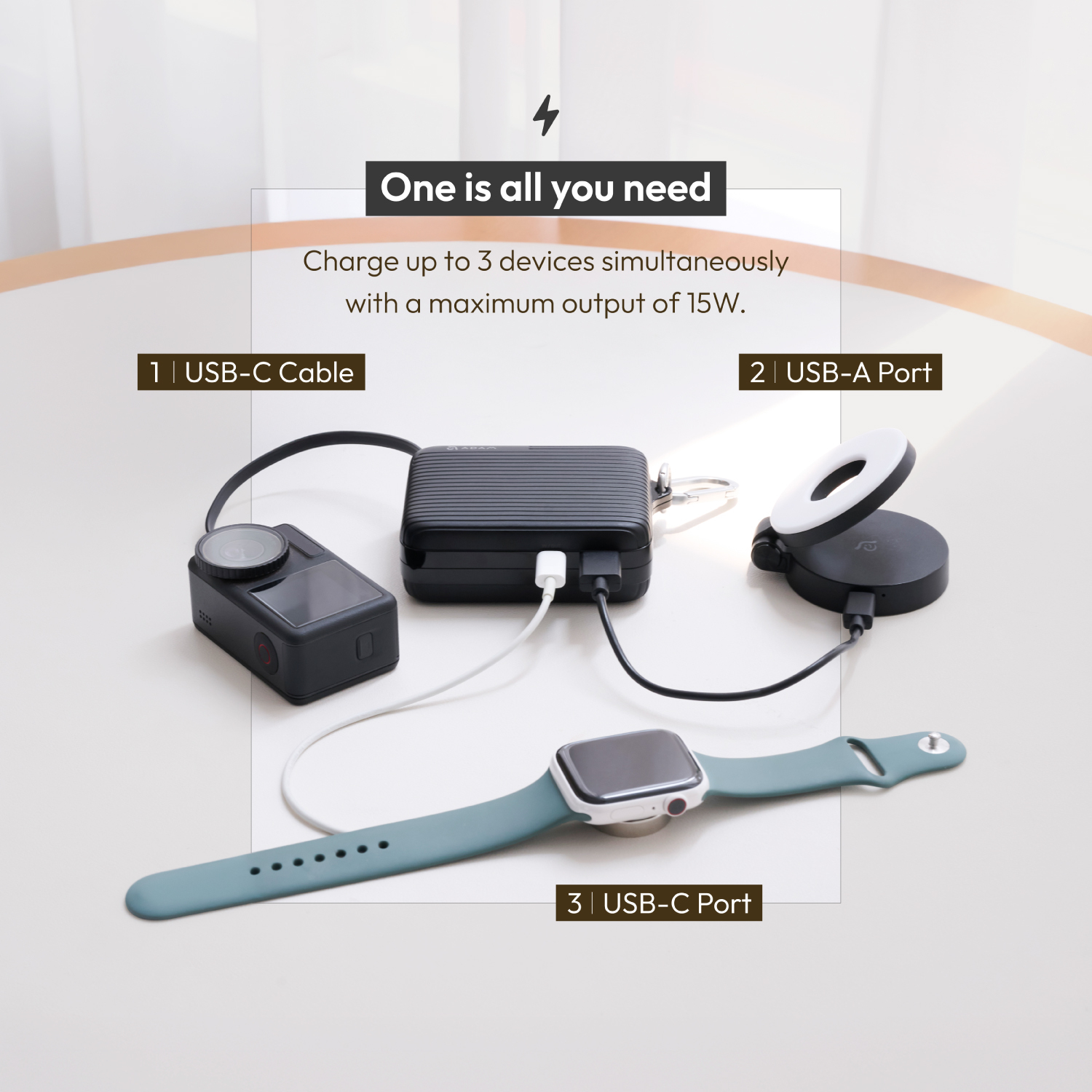 • Equipped with built-in USB-C cable, USB-C, and USB-A ports, allowing simultaneous charging for up to three devices with a maximum output of 30W