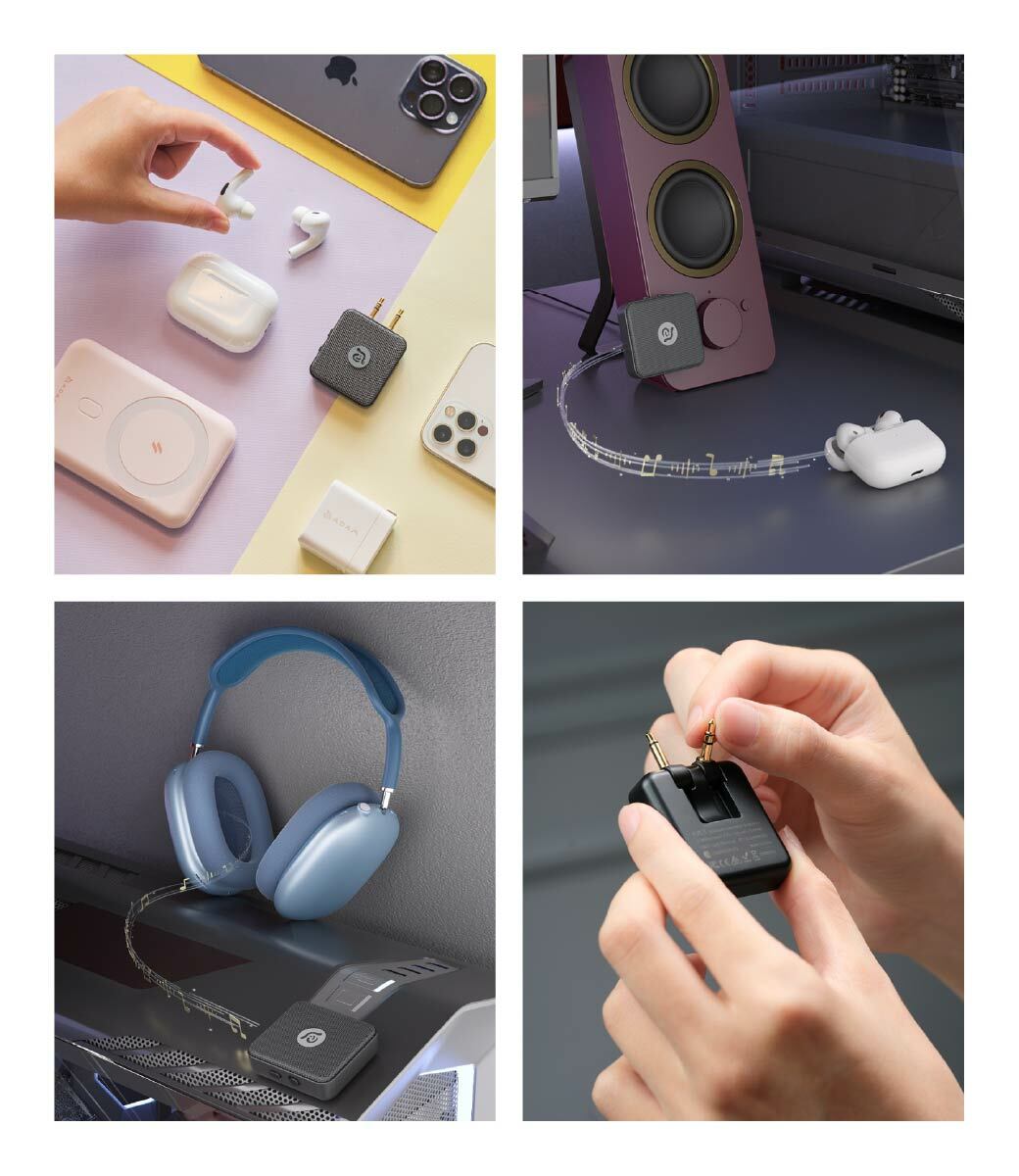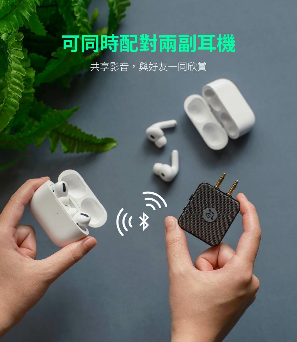 雙折疊插頭可直接插入飛機座椅音源孔,利用藍牙音訊傳輸一鍵快速配對AirPods,