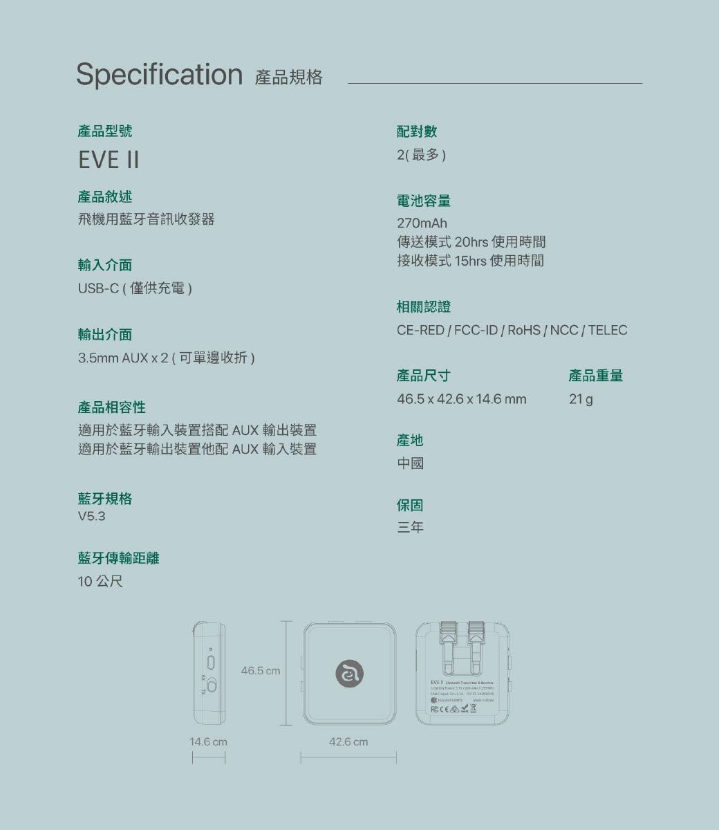 搭載藍牙5.3技術,支援傳送TX/接收RX雙向模式,可藉由快速切換鈕連接無藍牙功能設備,並可從行動裝置或電腦播放影音串流