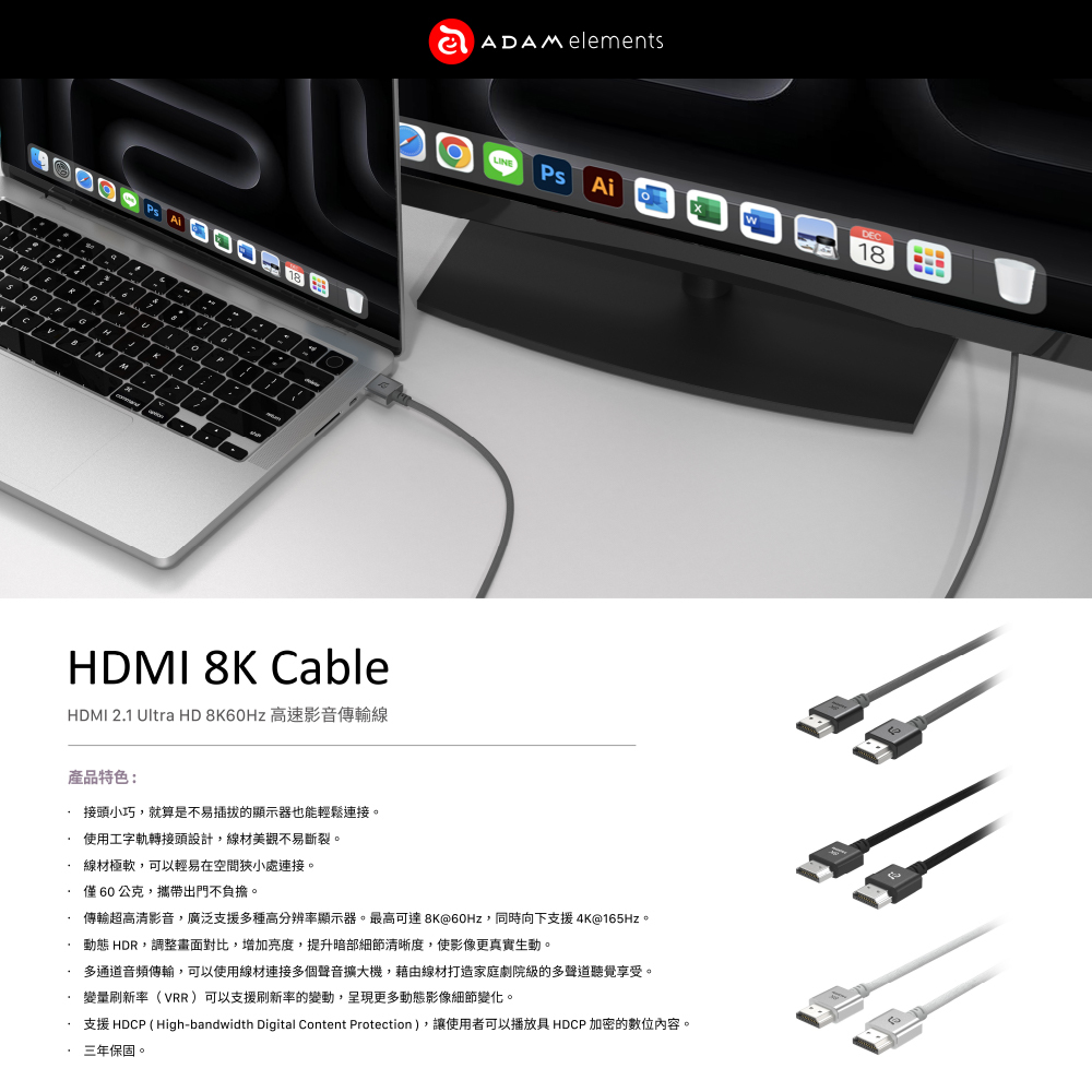 傳輸超高清影音,最高可達8K@60Hz,同時向下支援4K@165Hz,廣泛支援多種高分辨率的顯示器