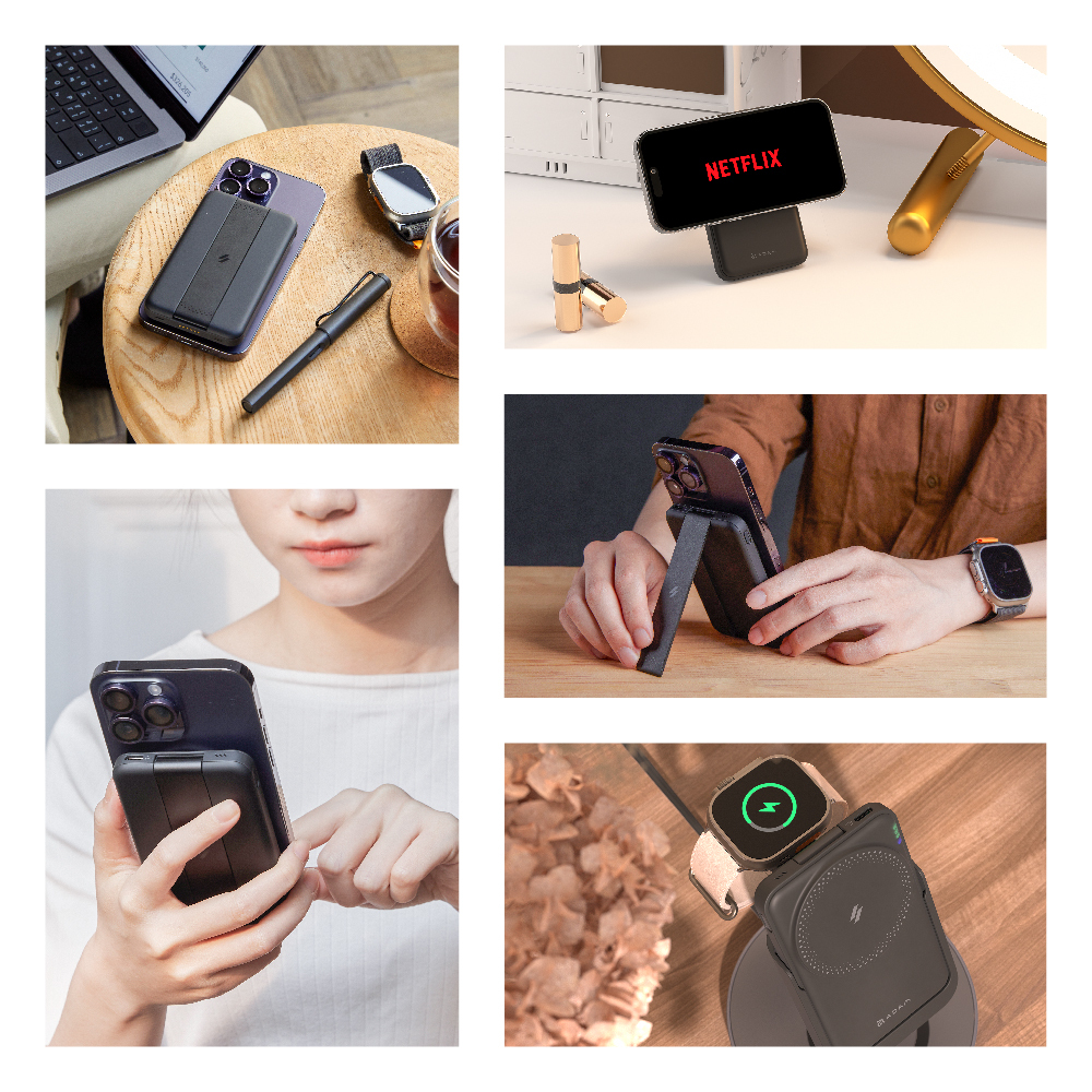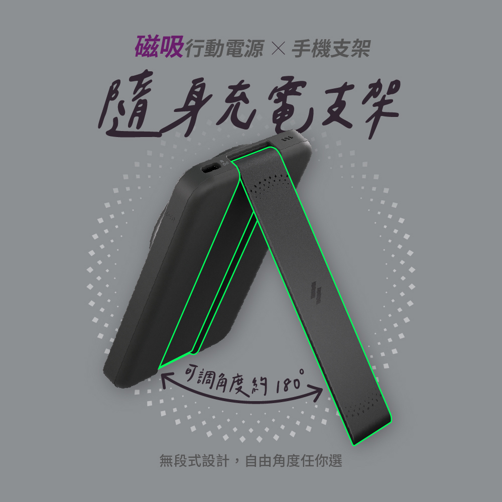 • 5000mAh磁吸行動電源同時支援USB-C孔有線充電,最高可達20W快速充電,獨特台階設計不擋鏡頭可邊充邊拍,行動電源並具備獨特支架設計,穩固追劇不間斷。