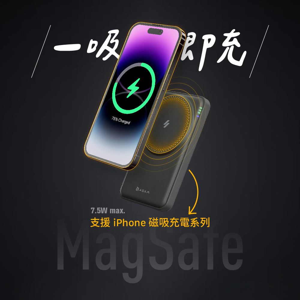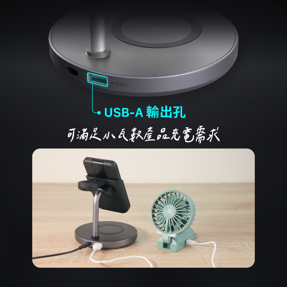• 具備USB-A 孔輸出,可滿足小瓦數產品充電需求,建議搭配33W USB-C充電器 ,達到『五機一體』的全方位充電體驗,磁吸充電模組iPhone充電最高支援7.5W。