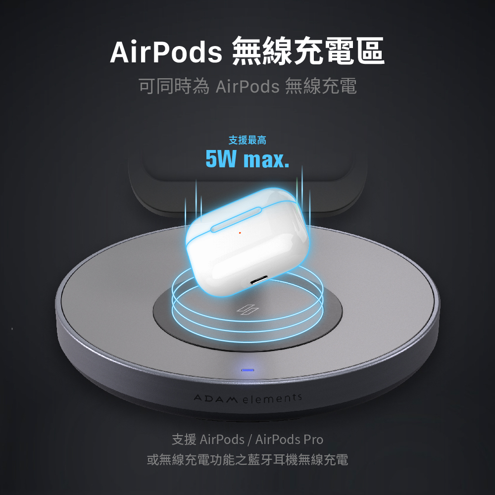 底座無線充電區可同步提供無線充電款AirPods充電,並支援其他具有無線充電盒之藍牙耳機充電。