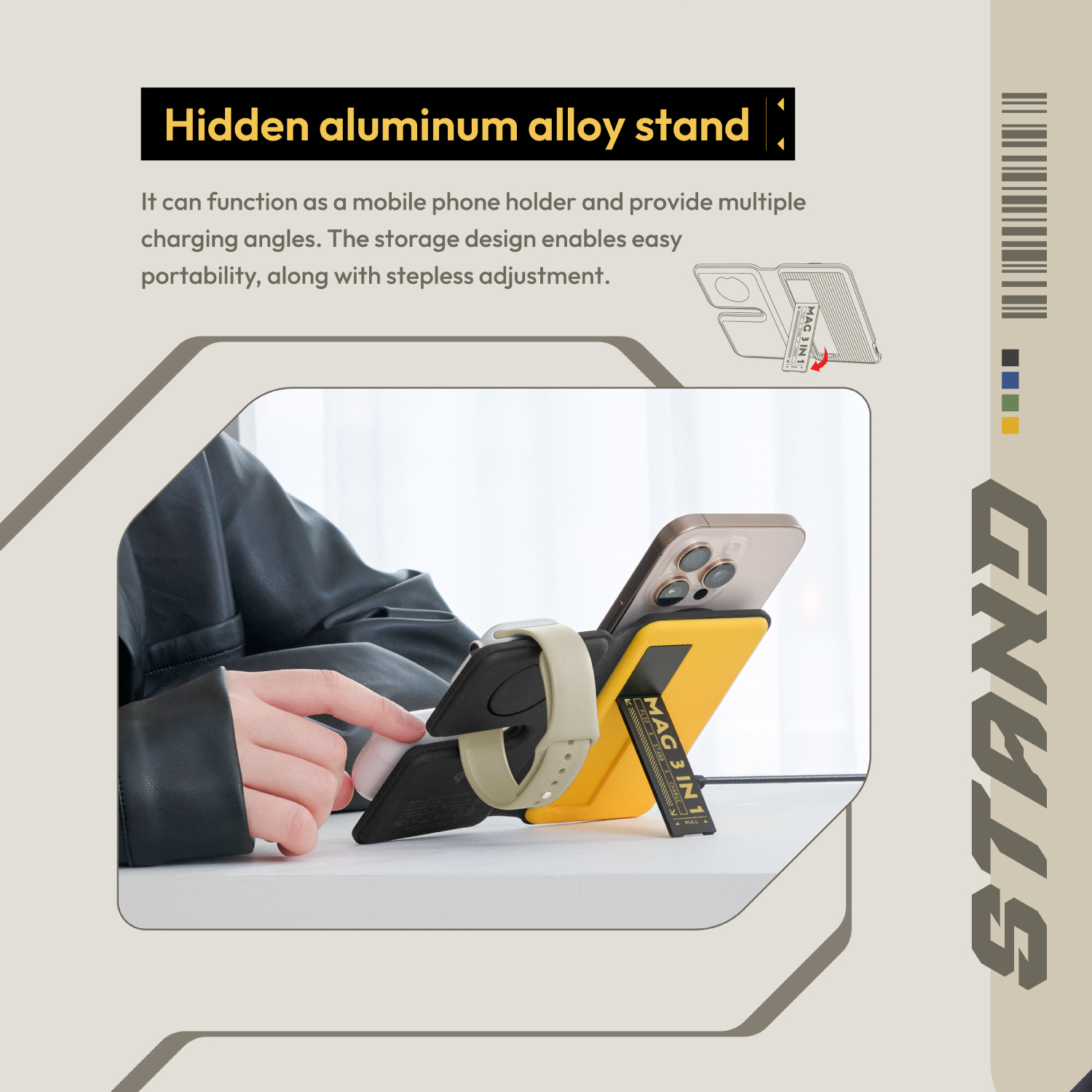 • 隱藏式鋁合金支架,提供多種充電角度