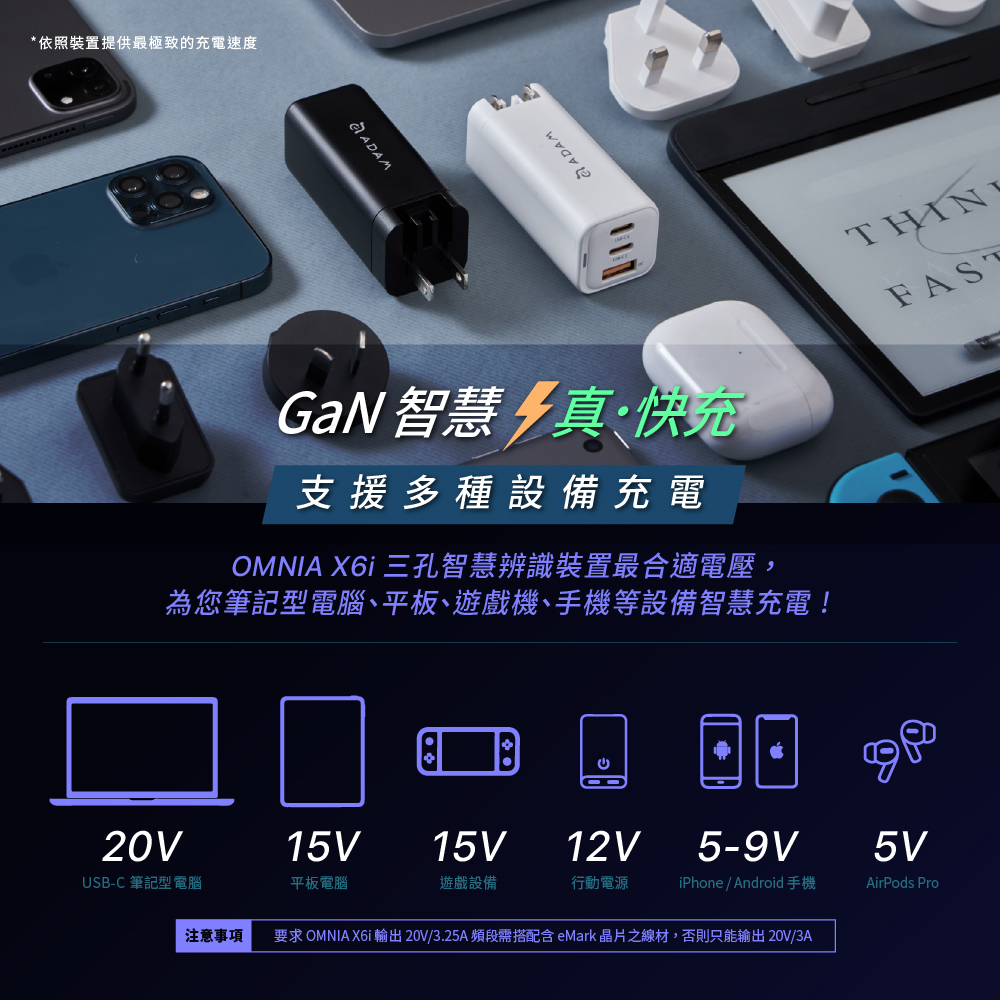 • 提供最大輸出66W,足以全速充電你的 iPhone, iPad, iPad Pro, Android手機, Switch遊戲機, MacBook系列筆電, 還有大多數支援USB-C 65W充電的筆記型電腦 。