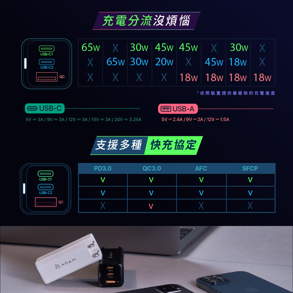 • USB-C單孔使用最大輸出65W / USB-A單孔使用最大輸出18W, 三孔同時使用時最大功率66W(USB-C1 30W + USB-C2 18W + USB-A 18W) 。