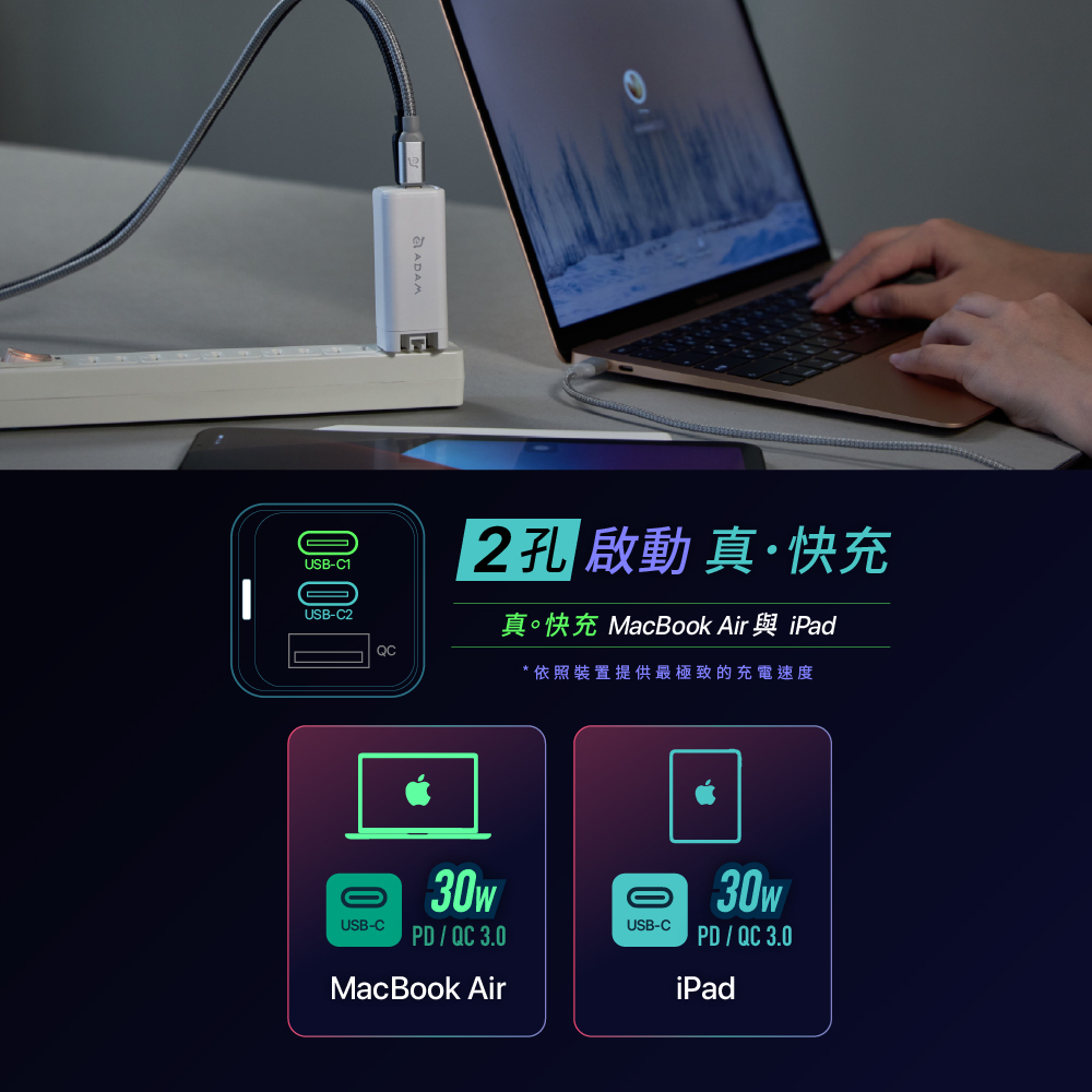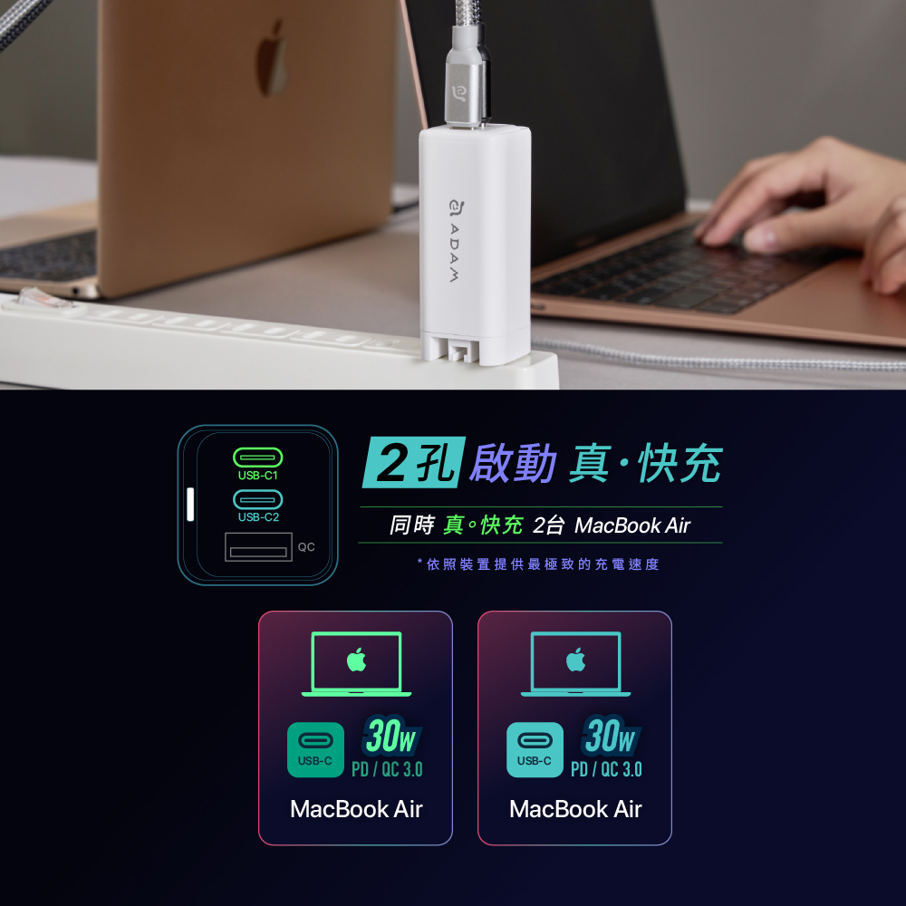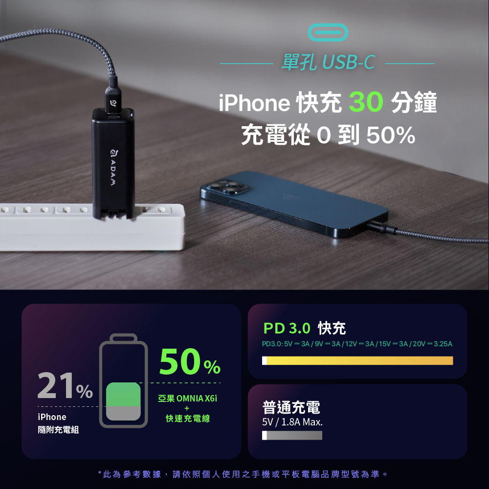 • 依照裝置提供最極致充電速度,iPhone 0~50%只要30分鐘,更可以在一個半小時內將MacBook充滿電 。