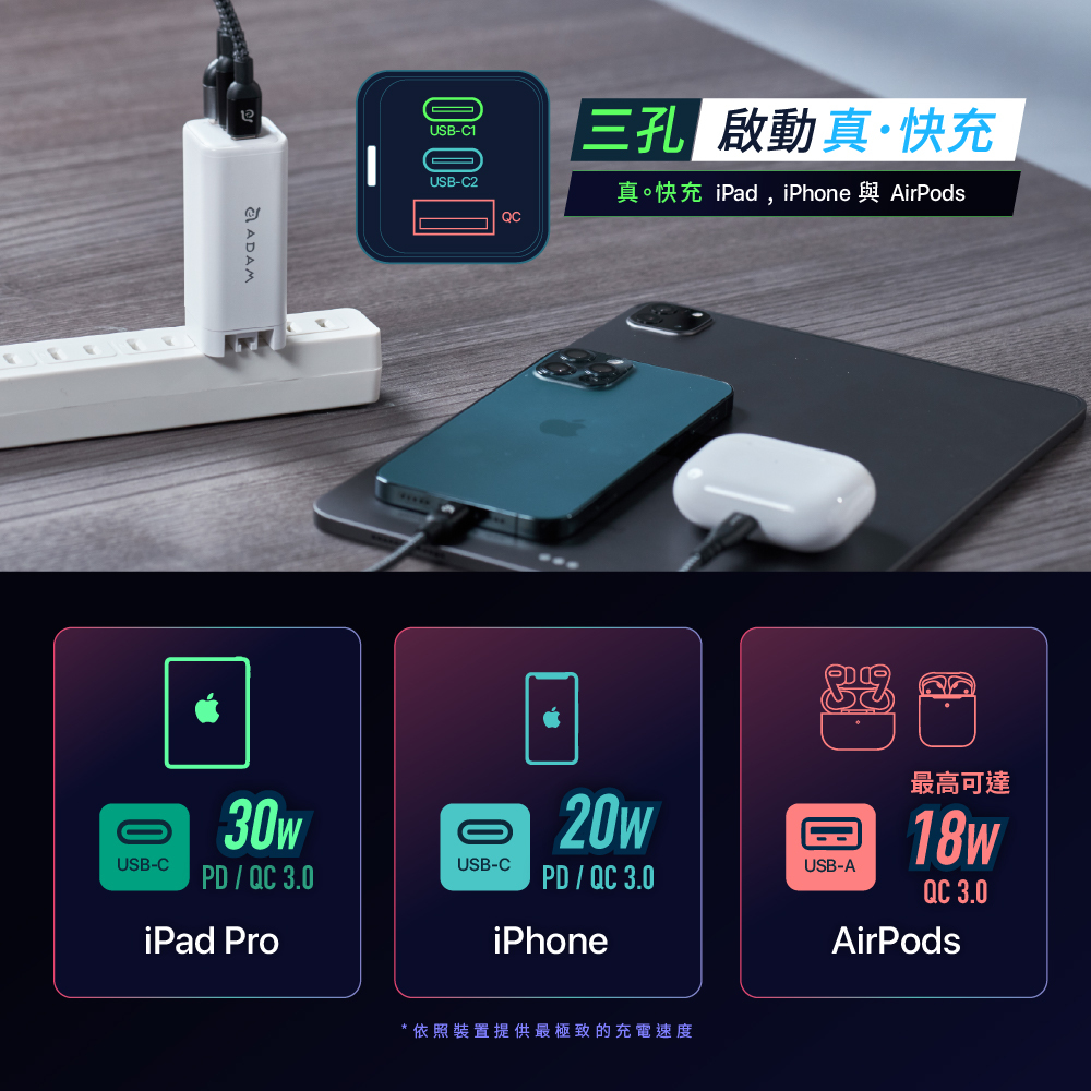 • 完美支援三孔快充,同時為你的三部裝置進行快速充電,再也不用煩惱誰先誰後。
